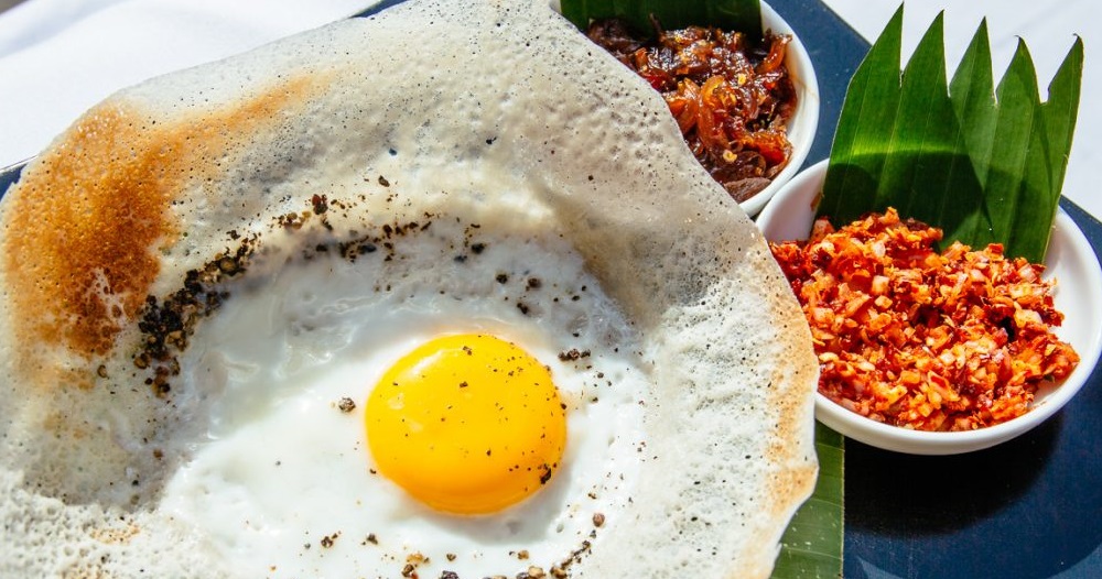 Sri Lankan counterpart for pancakes, these Hoppers are made from a batter of slightly fermented rice flour, coconut milk, and a hint of sugar. It’s a theatrical process where a ladle of batter is fried in a deep wok and swirled around giving it a bowl-shaped appearance. They are more commonly eaten at breakfast along with eggs that are cooked in the wok to create an “egg in a nest” appearance.
